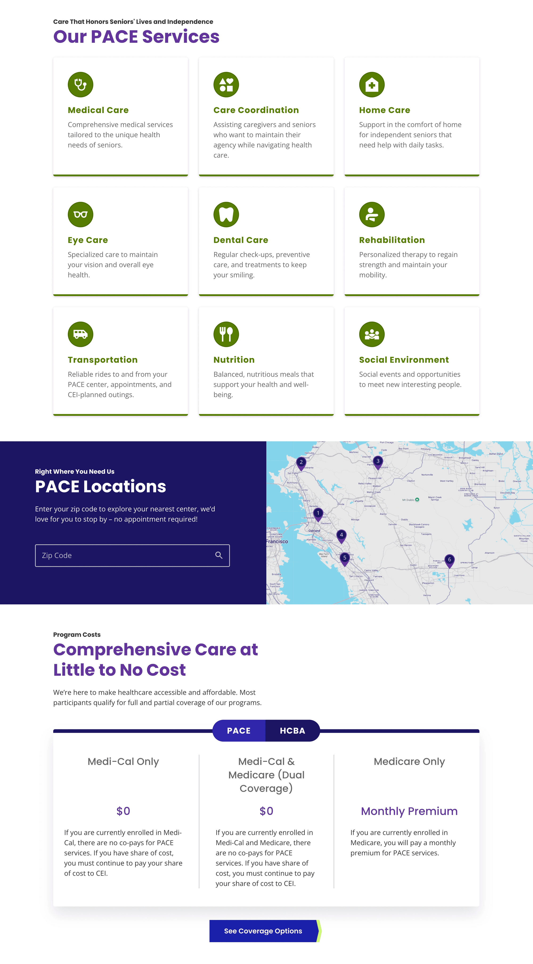 Partnering with Center for Elders' Inedpendence (CEI), our UX team led the redesign of their outdated website to help seniors and caregivers better understand their healthcare options through the PACE program. I collaborated closely with our lead UX designer to shape the research synthesis, page structure, and component system that would support CEI's goals of driving clarity, trust, and inquiries - all while creating a scalable and maintainable system for our agency's UI design and development teams.