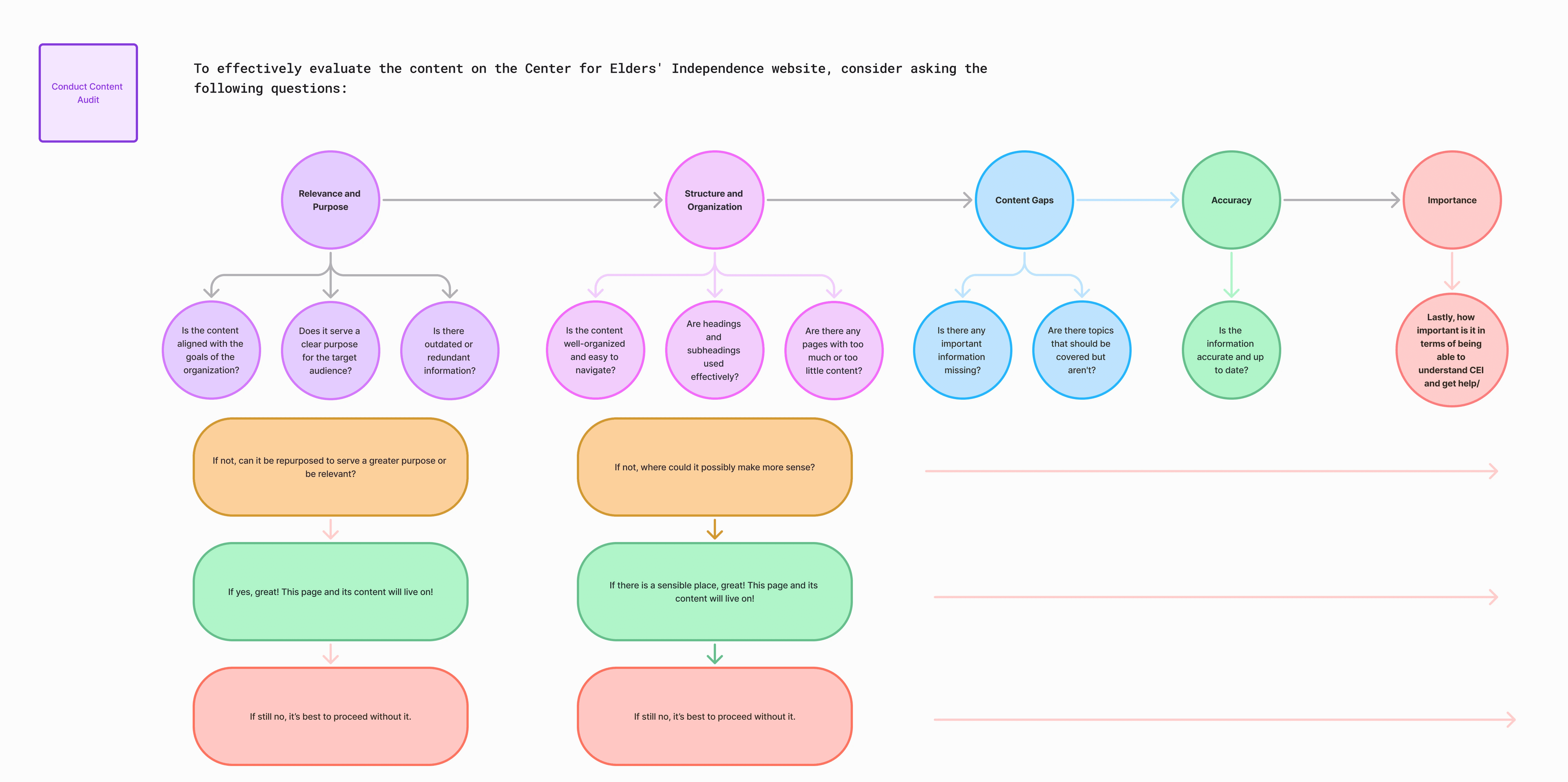 My design lead and I used this framework to evaluate each page’s relevance, structure, and accuracy. It helped us identify what to keep, revise, or remove—ensuring all content supported user needs and organizational goals.